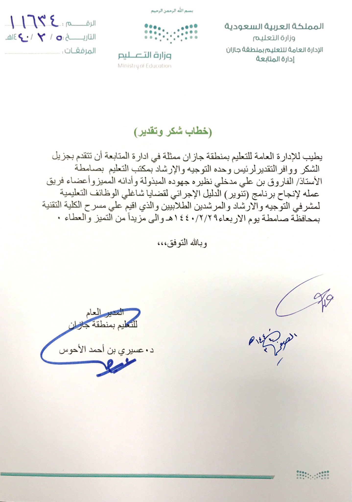 وحدة الإرشاد بصامطة بنين On Twitter خطاب شكر من سعادة المدير العام للتعليم بمنطقة جازان لرئيس وحدة التوجيه والارشاد بمكتب تعليم صامطة