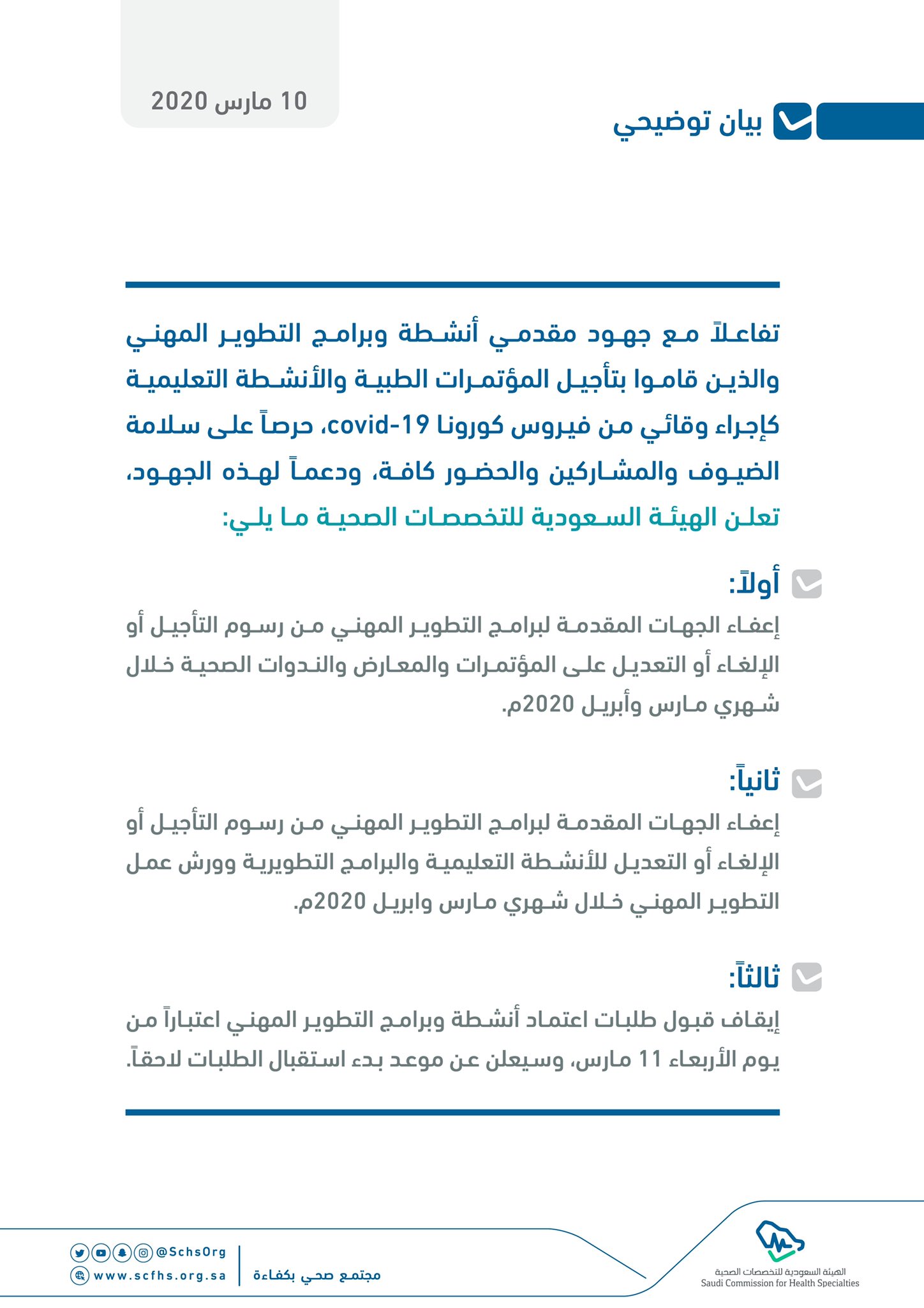 هـ يـ ئـ ة الـ تـ خـ صـ صـ ا ت الـ صـ حـ يـ ة On Twitter الهيئة السعودية للتخصصات الصحية تدعم جهود مقدمي أنشطة وبرامج التطوير المهني في اجراءاتها الاحترازية للوقاية من فيروس كورونا